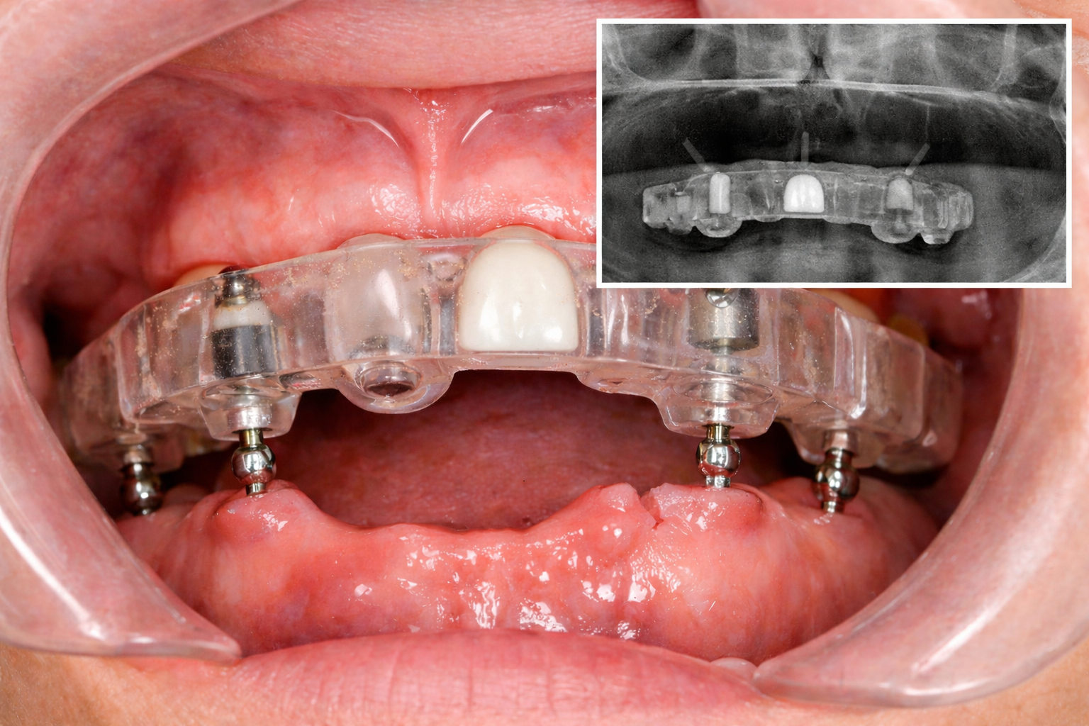 Альтернативным, аналоговым методом является использование аппарата GonyX. В него вручную вводят координаты имплантатов. На основе рабочей гипсовой модели изготавливают два шаблона: рентгенологический (с рентгеноконтрастными коронками, имитирующими будущий протез) и хирургический.