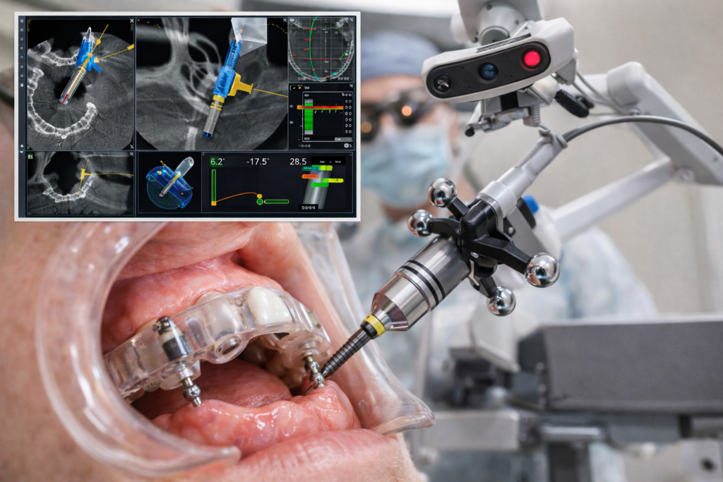 Примером такого оборудования служит прибор MicronTracker (ClaroNav, Торонто, Канада). В его основе лежат стереоскопические датчики, которые обнаруживают и отслеживают специальные маркеры — цели оптического слежения, или сканмаркеры. Эти объекты фиксируются на хирургическом наконечнике и непосредственно на челюсти пациента. Оптическая камера системы непрерывно считывает положение сканмаркеров, а программное обеспечение в реальном времени отображает на экране трёхмерный аватар фрезы в сагиттальной, осевой и корональной проекциях.Главное преимущество технологии — возможность интраоперационной коррекции. Хирург контролирует всё вмешательство в режиме реального времени и может мгновенно изменить траекторию или глубину препарирования, чтобы избежать повреждения критических анатомических структур, таких как нижнечелюстной нерв. Именно эта способность адаптироваться в ходе операции дала название системе — динамическая навигационная хирургия. Виртуальная визуализация положения инструмента относительно анатомических структур обеспечивает высочайшую точность и безопасность дентальной имплантации.